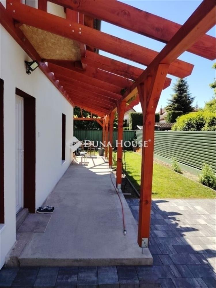 Budapest XVI. Szentgyörgytelepen eladó egy bruttó 71 m²-es körbejárható családi ház, 259 m²-es telken, hatalmas L alakú nyitott terasszal, kerti fedett grillező/sütögető résszel, de akár jacuzzi is elhelyezhető ezen a területen.