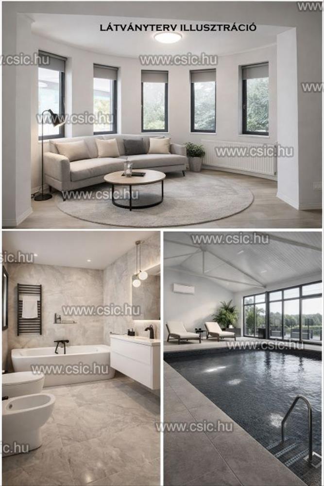 A családi ház egyik legkülönlegesebb eleme a különálló wellness szárny. a 124 m²-es fedett térben kialakított beltéri medence, amely nyakzuhannyal és hangulati medencevilágítással ellátott, egész évben használható, így a kikapcsolódás és feltöltődés élménye az otthon részévé válik. a szauna és a kapcsolódó helyiségek tovább emelik a komfortszintet, míg a télikerten keresztüli átjárás elegáns kapcsolatot teremt a főépület és a wellness tér között. a korszerű működést a 22 panelből álló napelemes rendszer támogatja, amely hatékonyan csökkenti az energiafelhasználást, különösen a wellness részleg üzemeltetésében. Ez a megoldás nemcsak gazdaságosabb fenntartást biztosít, hanem hosszú távon is fenntartható és értékálló működést tesz lehetővé. a telken belül több gépjármű számára biztosított a parkolás, emellett egy fedett garázs is rendelkezésre áll. Az elektromos kapu, a kamerarendszer és a riasztó a biztonság magas szintjét garantálják.
