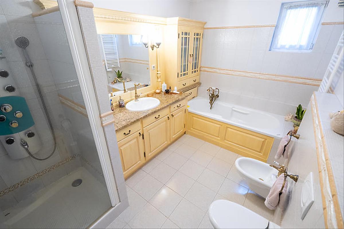 A nappali és szobák laminált parkettásak, míg a többi helyiség egyedi mediterrán stílusú járólappal burkolt.