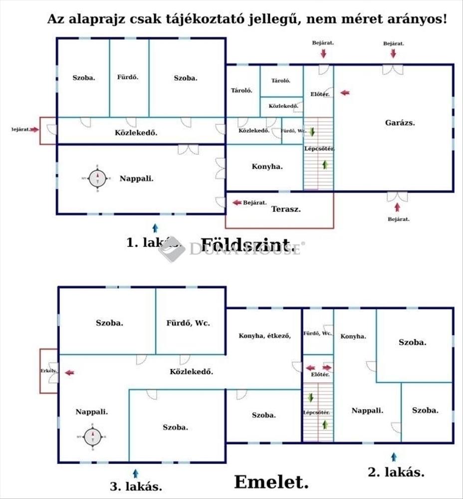 A zárt közös lépcsőházból a felső szintre érve, két külön lakást találunk jobbra egy közel 50 m2 lakrészt, három szobával, fürdővel, konyhával és egy nappali résszel.