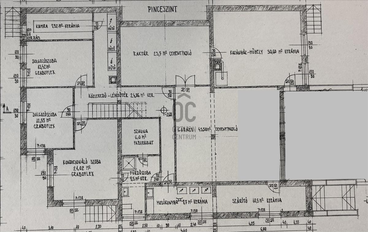 A pince a közös szélfogón keresztül közelíthető meg, saját berendezett műhellyel, dupla garázzsal, szaunával és a kiszolgáló helyiségek is itt találhatóak.