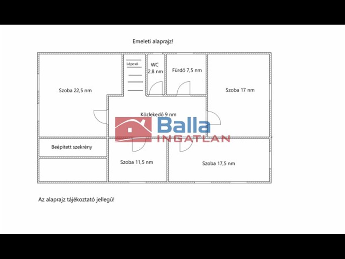 -Az emeleti szinten, 4 hallószoba, fürdőkádas fürdőszoba, külön wc, és közlekedő található. a nagyobbik szobában egy faltól falig tartó nagy beépített szekrény van ami az ingatlan részét képezi.