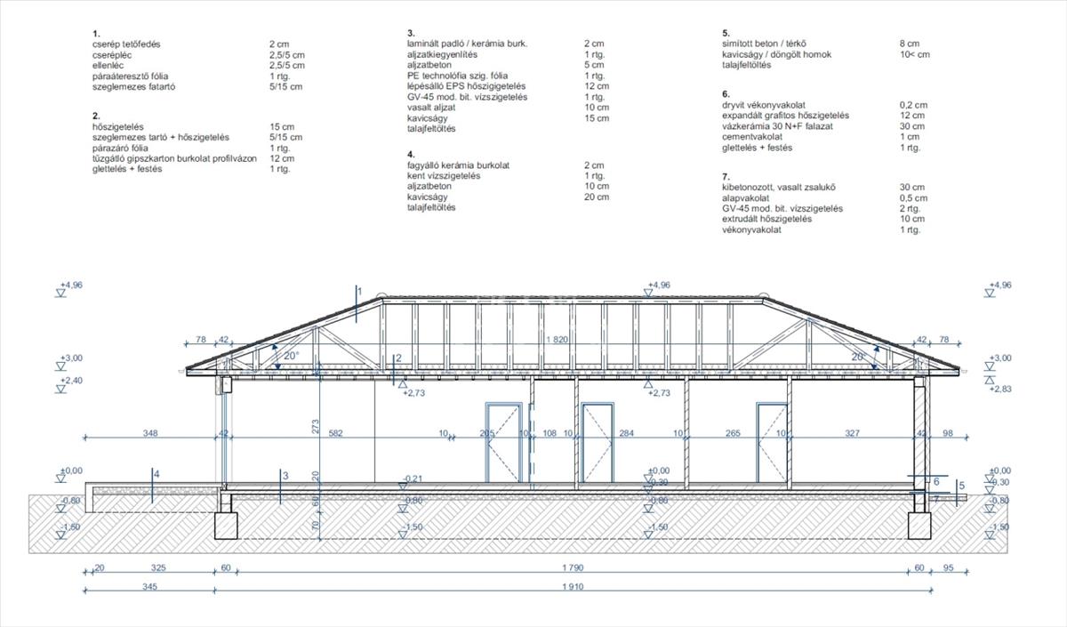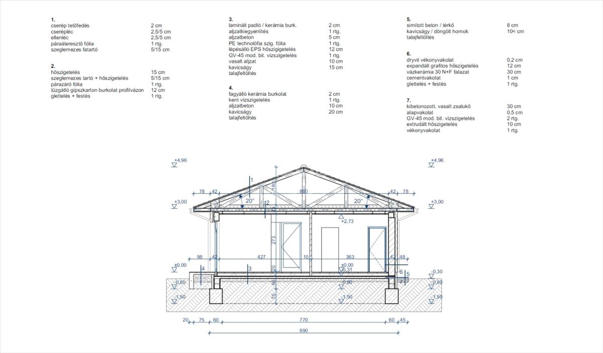 Az épület Porotherm 30-as tégla falazattal, 14 cm-es grafitos homlokzati szigeteléssel és 30 cm vastag tetőszigeteléssel készül. a fűtést és a melegvizet 12 kW-os hőszivattyú biztosítja, a teljes ingatlanban padlófűtéssel, míg a hűtést fancoil egységek látják el.