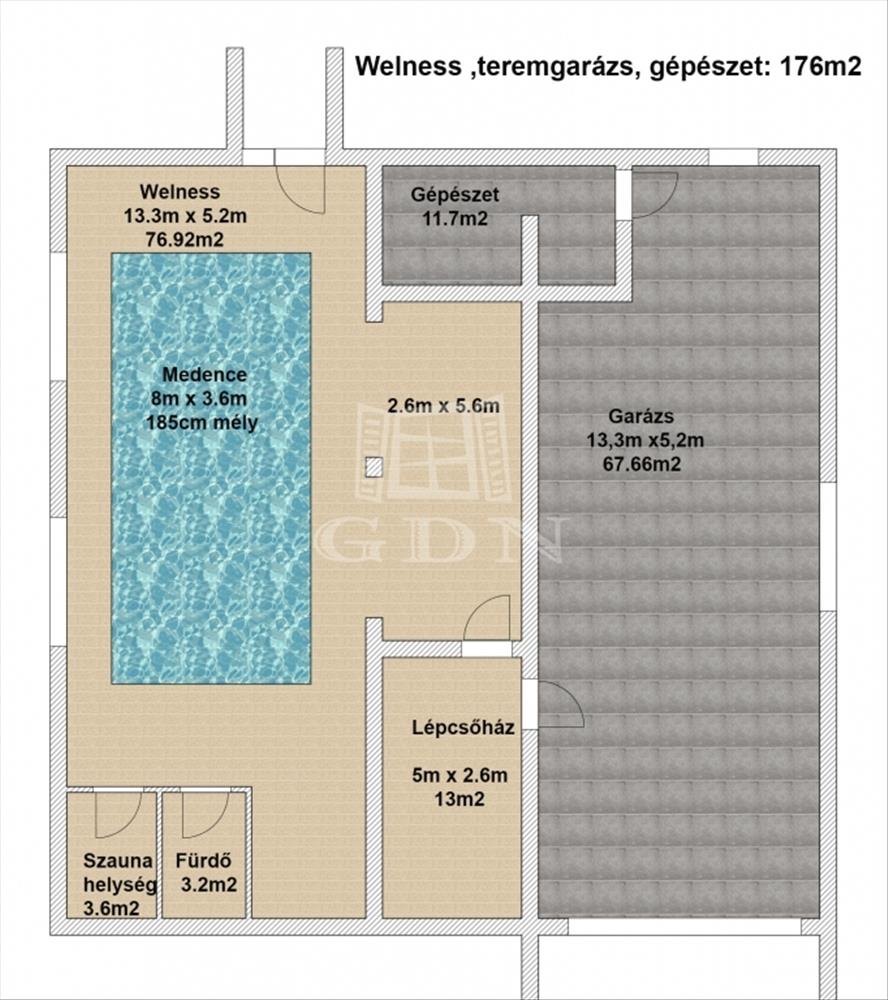 Külön kazán biztosítja a szuterén szinten elhelyezkedő 8x3, 6 méteres 185 cm mély medence fűtését.
