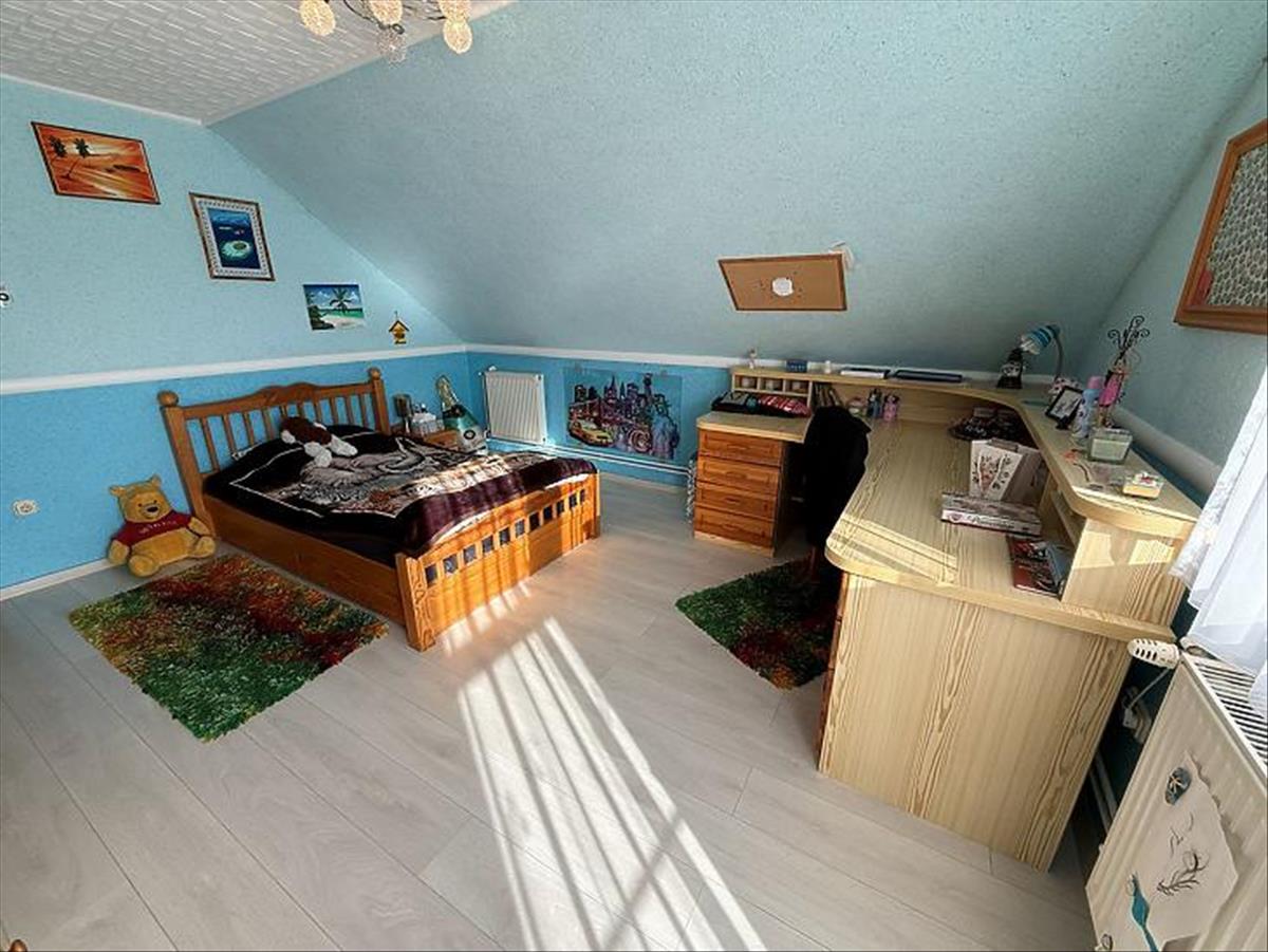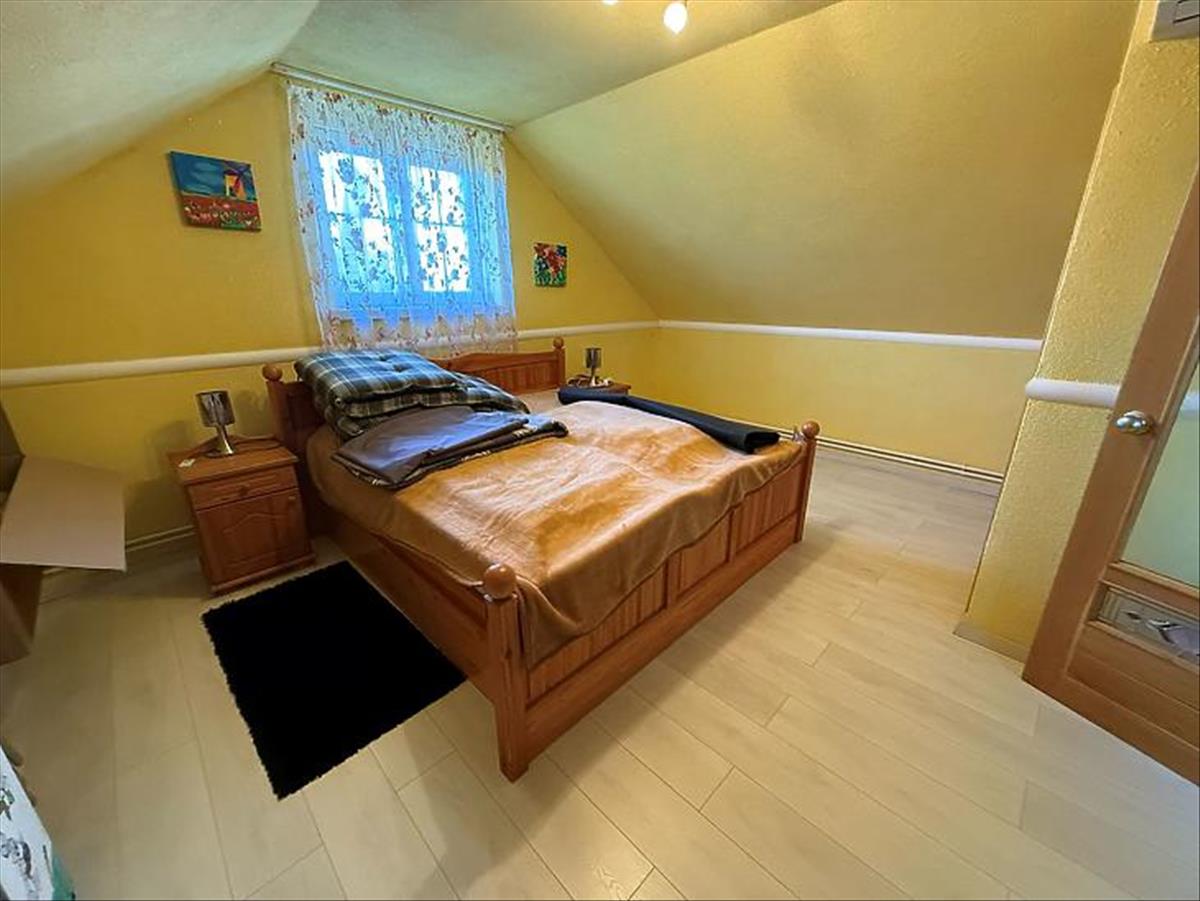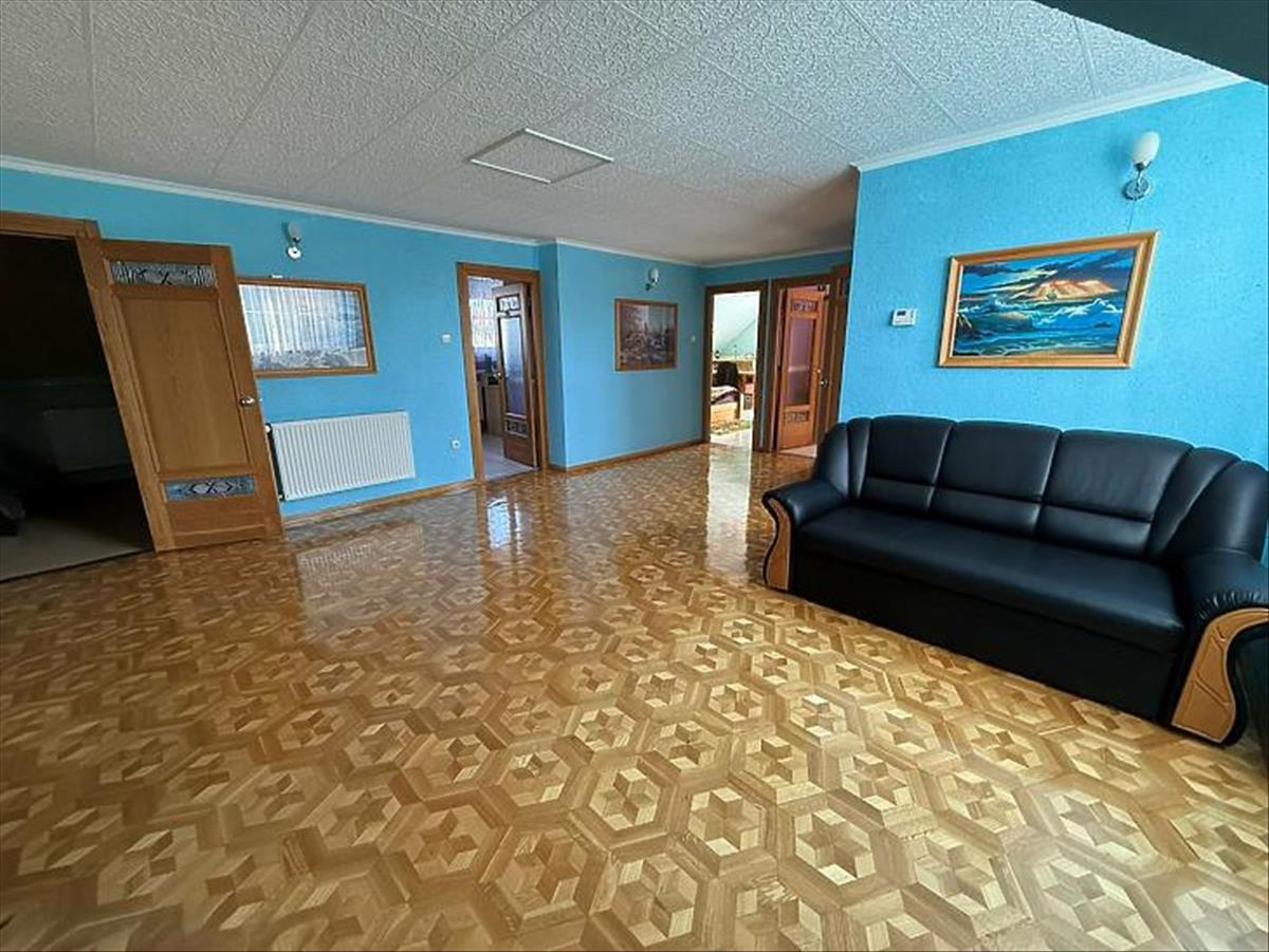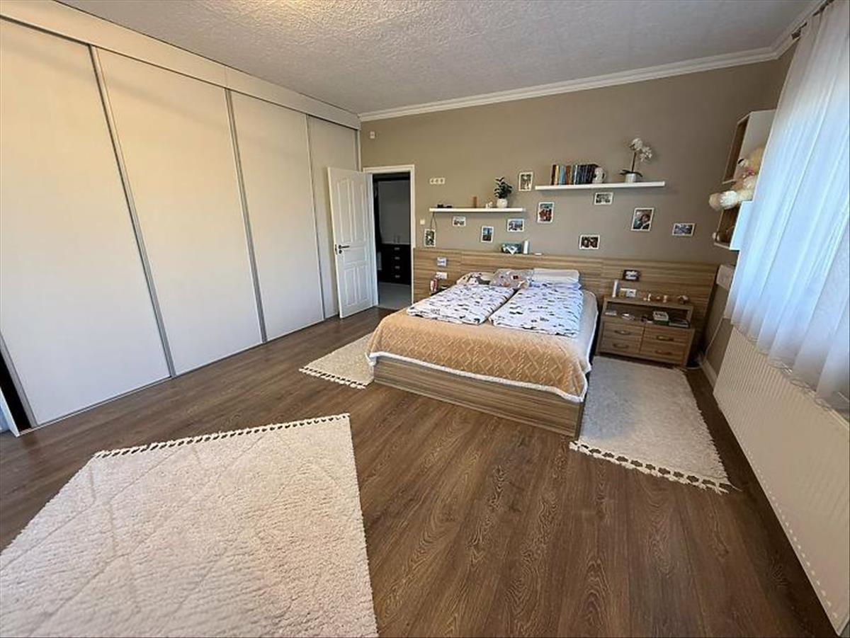 Emelet: 5 szoba, kádas fürdőszoba, + wc, gardrób, közlekedő, mosókonyha, erkély.