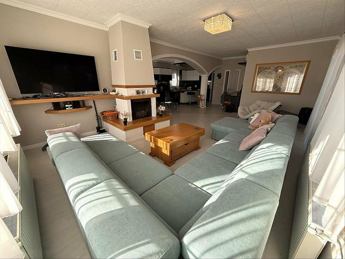 A földszinten tágas nappali található kandallóval, amely kellemes hangulatot teremt.