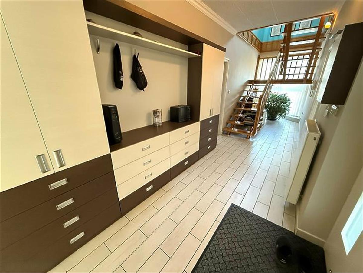 Az emeleten a szobák parkettásak, a gardrób padlószőnyeggel borított, a további helyiségek pedig járólapos kialakításúak.