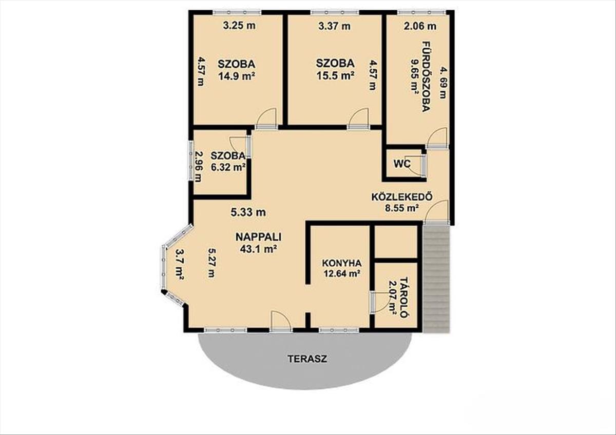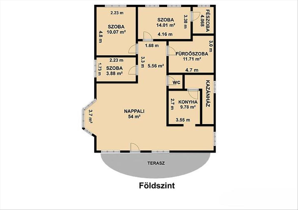 Emelet: 3 szoba, nappali, konyha, fürdőszoba, wc, tároló, terasz, közlekedő.