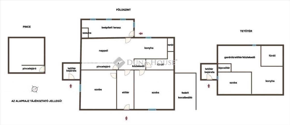 Földszint: nappali, konyha, 3 szoba, fürdőszoba + wc, közlekedő, beépített terasz szaunával