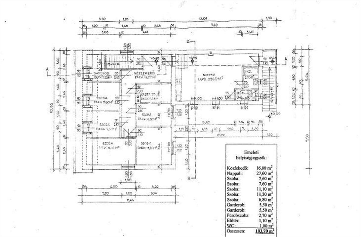 Emelet: 5 szoba, nappali, fürdőszoba, wc, 2 gardrób, előtér, közlekedő.