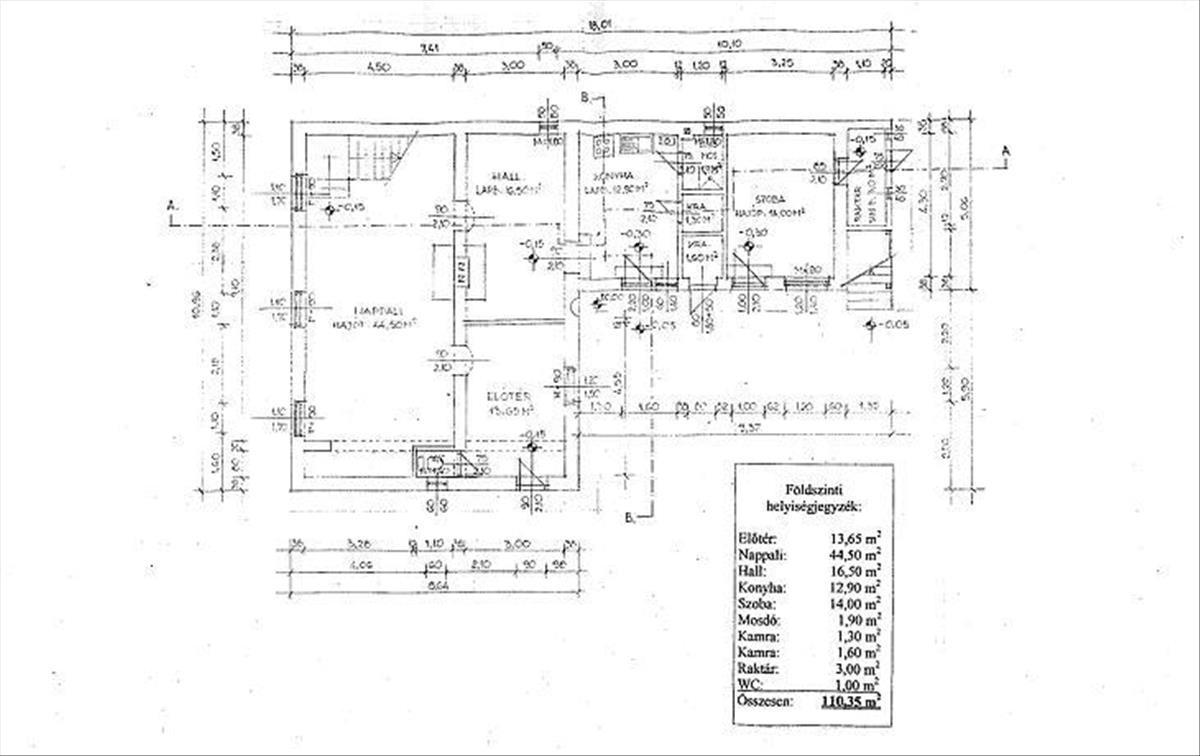 Földszint: Előszoba, hall, nappali, konyha + étkező, kádas fürdőszoba, 2 wc, 2 kamra, előtér, raktár.