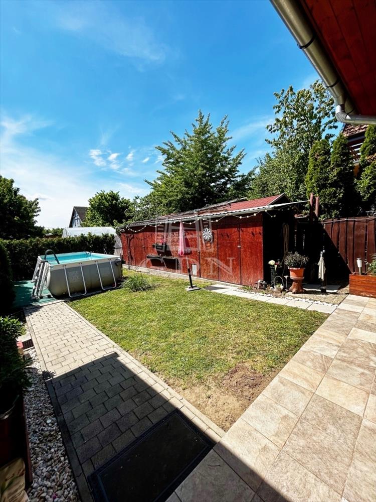 A teraszról kilépve a pihenésre és kikapcsolódásra alkalmas kertbe érkezünk, ahol helyet kapott egy 12 nm-es tároló, mely szerszám és kerti eszközök tárolására kiválóan alkalmas.