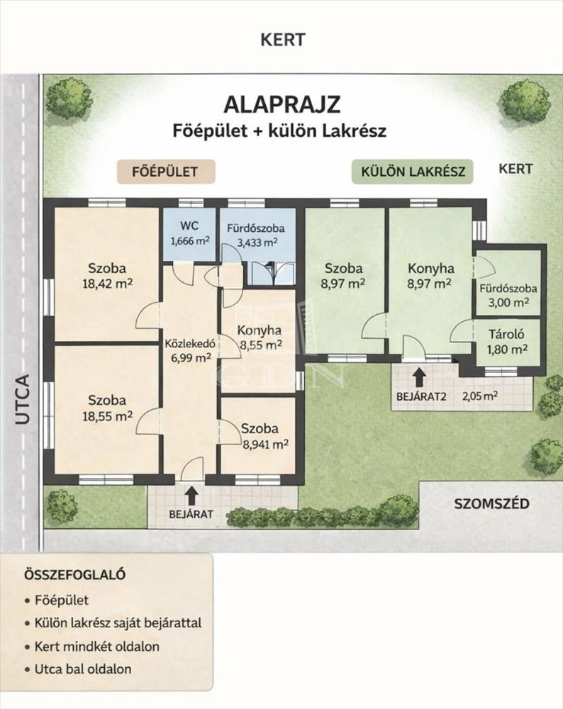 Ha olyan ingatlant keres, ahol a család együtt, mégis külön élhet, ez a 913 m²-es telken elhelyezkedő, kétlakásos lehetőség kiváló választás.