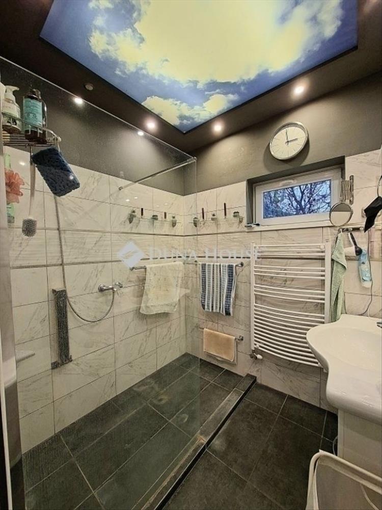 Tágas, igényes fürdőszoba egyedi, mennyezeti égbolt világítással, törölközőszárítóval, épített üvegfalas zuhanykabinnal. Külön helyiségben található a WC.