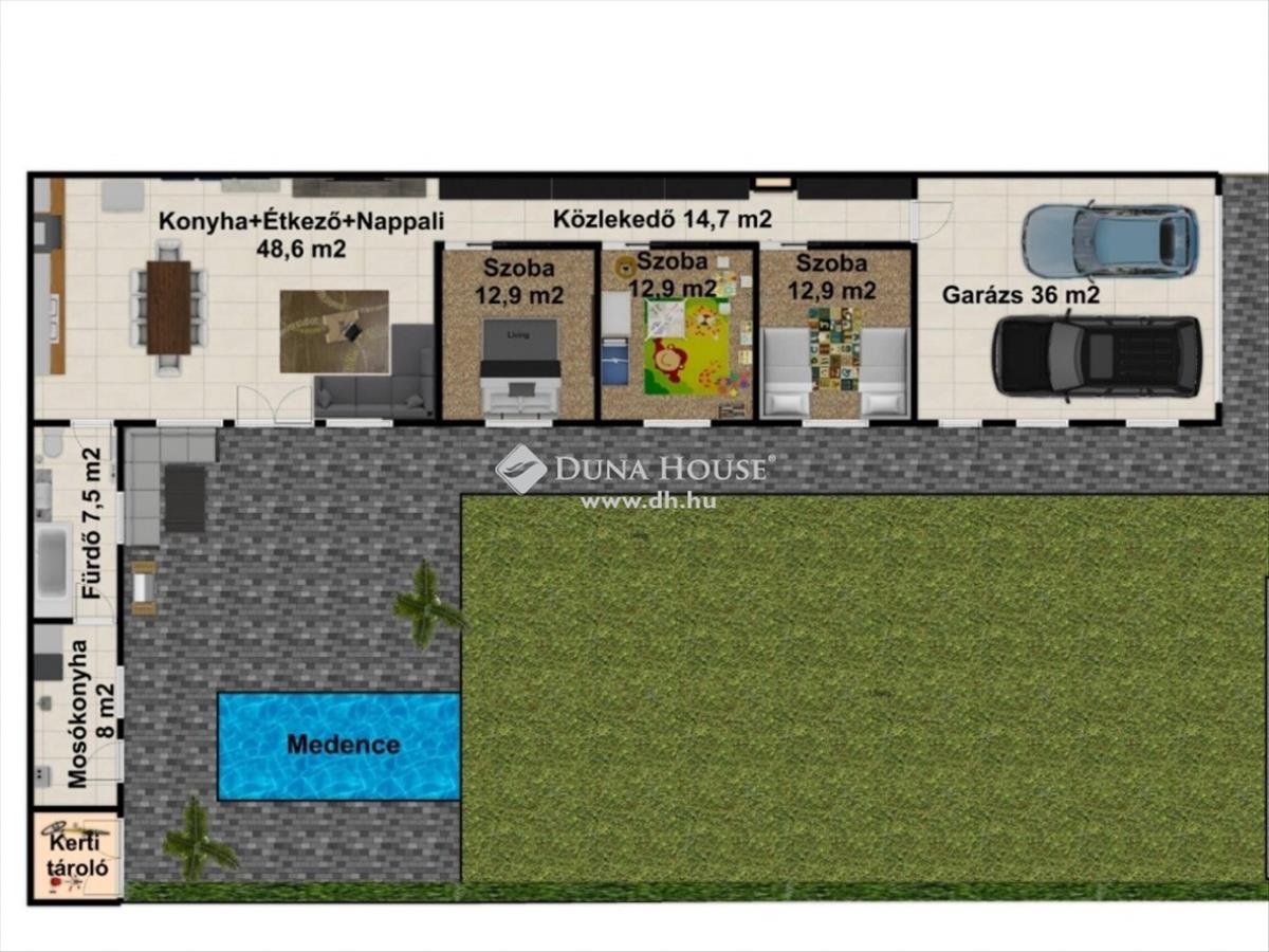 Az ingatlanban a nappali+ amerikai konyha mellett 3 külön nyíló szoba, amelynek a műanyag nyílászárói a zöld parkosított kertre néznek, ahol egy medence és jacuzzi is helyett kapott. a nappaliból nyílik a fürdőszoba és a mosókonyha.