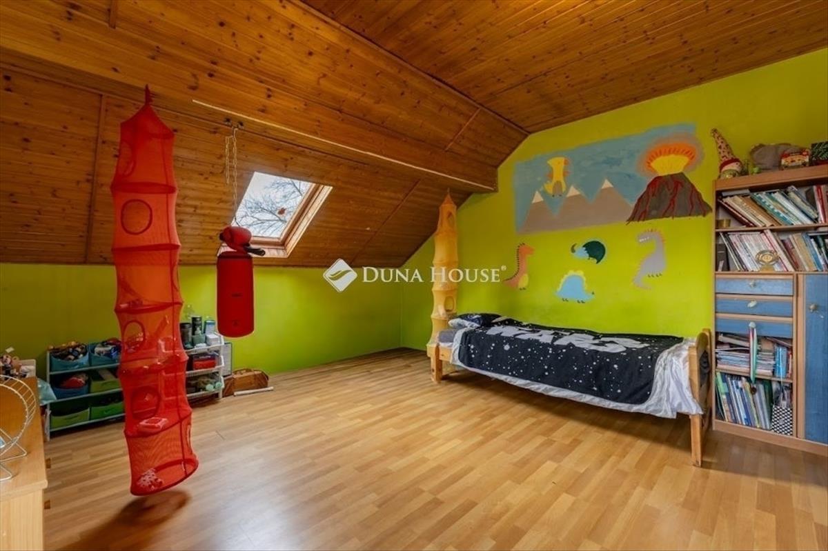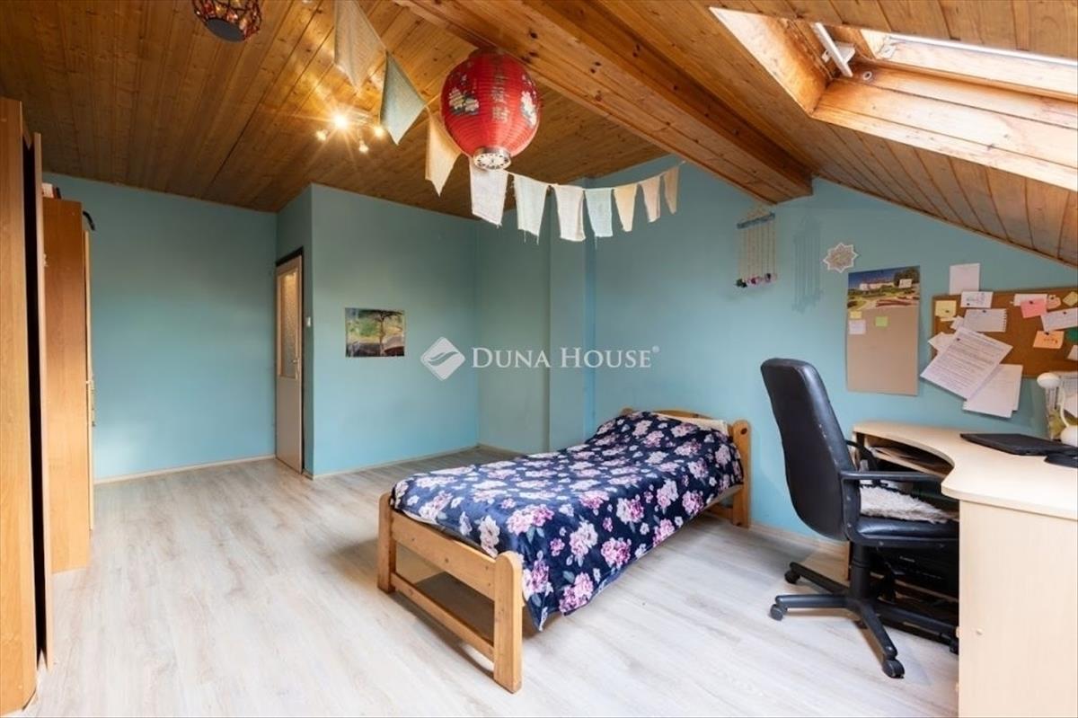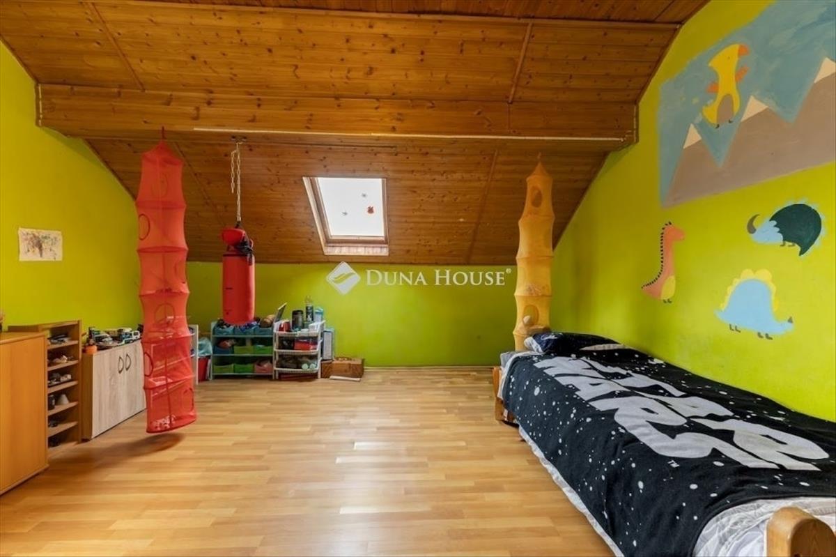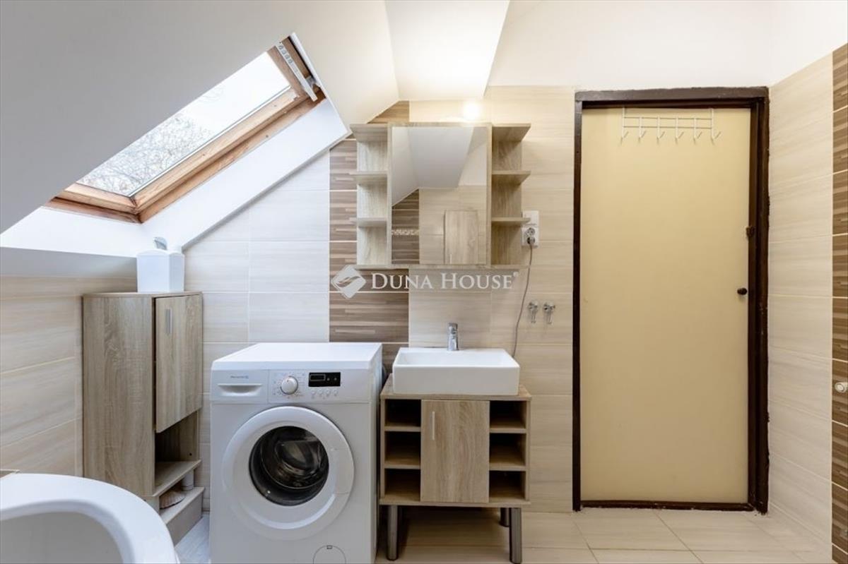 Az alsó szintről masszív, beton szerkezetű lépcsőn érhetjük el a tetőteret, ahol egy előtér, egy tároló, a konyha étkezővel, valamint 2 szoba, egy kádas fürdőszoba és a külön-bejáratú wc került kialakításra 2023-ban.
