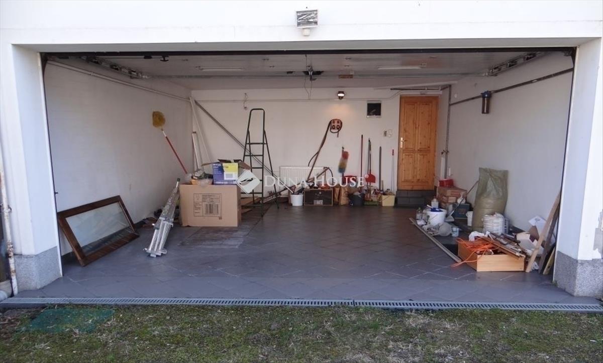 A házhoz tartozó dupla garázsban két autó is kényelmesen elfér, plusz szerelőakna és oldalsó tárolórész is helyet kapott. a tetőtér 128 nm-es, jelenleg egy nagy, világos térrel, hálószobával és fürdőszobával, de akár több szobára is osztható.