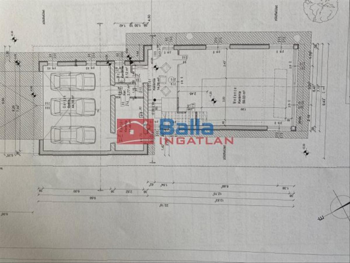- Paved ramp of 42 m2 size with an interior garage fitting three cars,