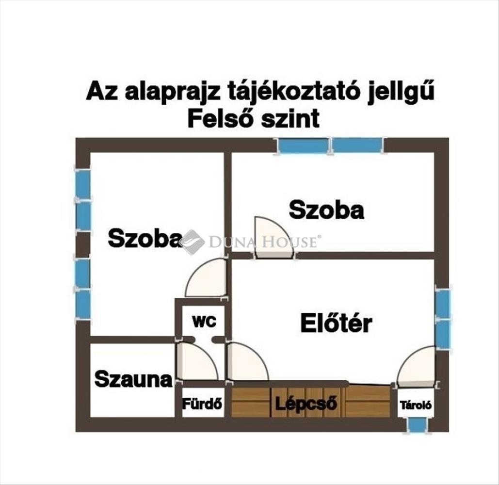 Az emeletre az egyik földszinti szobából, vas szerkezetű, fa lépcsőfokokkal szerelt lépcső vezet. 58 Nm-es alapterületén két egész szoba, egy szaunával ellátott fürdő és wc helyiség, egy előtér és egy kisebb tároló található. a felső szinten az ablakok hőszigetelő üvegezésű fa, illetve műanyag szerkezetek vegyesen.