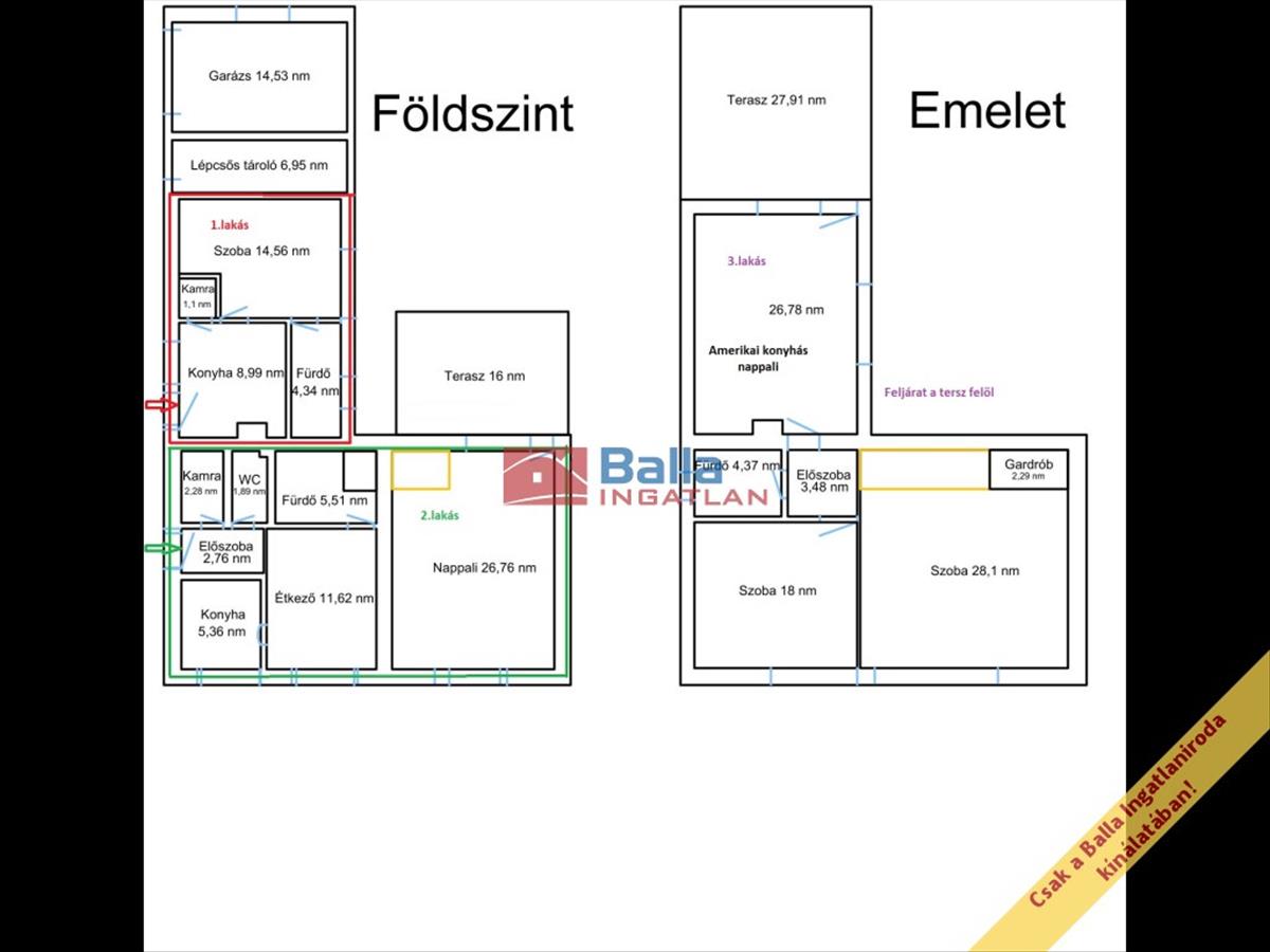 Három külön lakás lett kialakítva, külön bejárattal: