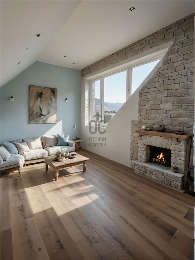 Az emeleten, ahogy a lépcsőről megérkezünk, egy kis nappalit/közlekedőt találunk, igény szerint ezen a részen egy szoba kialakítható.