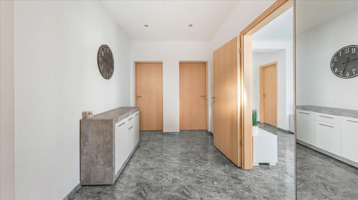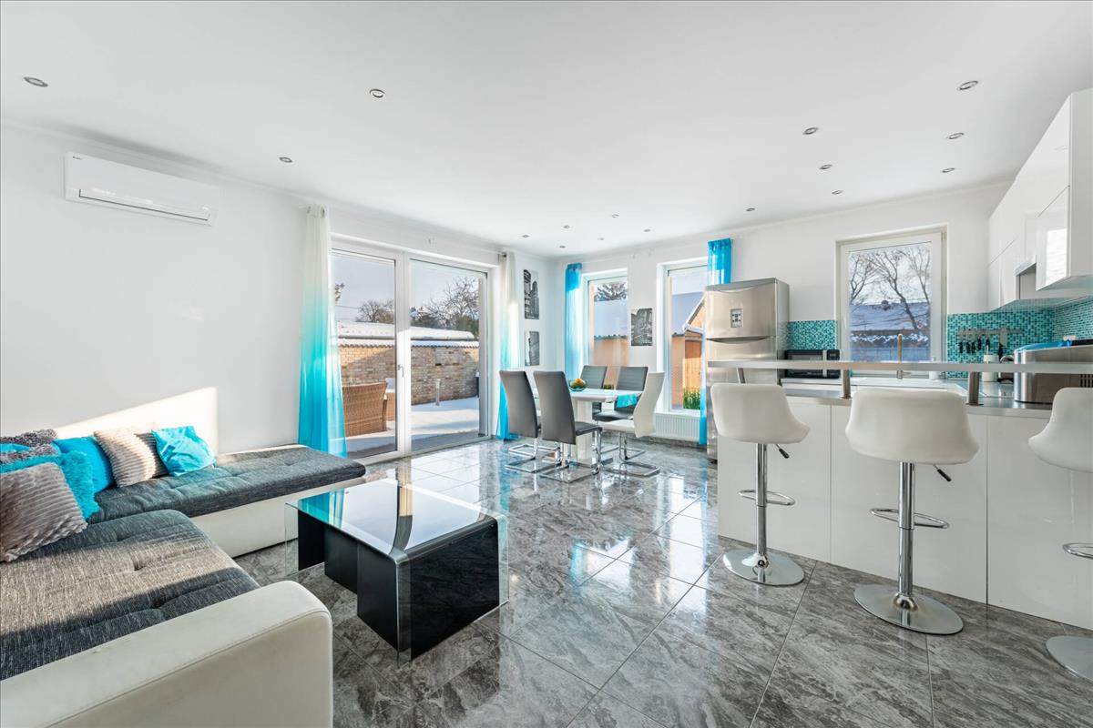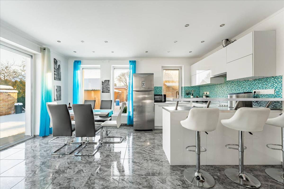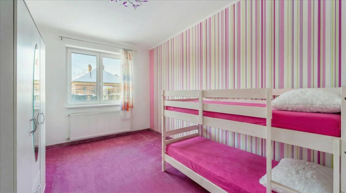 A ház belső elrendezése praktikus és élhető, jól alkalmazkodik egy család mindennapjaihoz, hiszen a tágas nappali mellett három külön nyíló hálószoba biztosítja a szükséges életteret és a privát szférát.