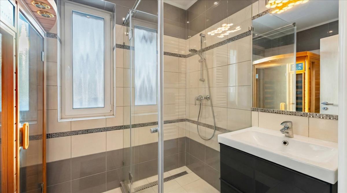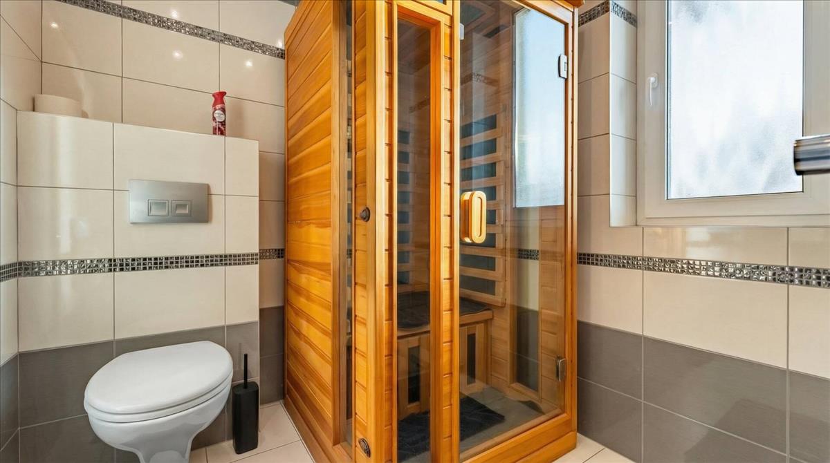 A két fürdőszoba kényelmes megoldást nyújt, különösen az infraszaunával felszerelt fürdő, amely a nap végén valódi kikapcsolódást ad.