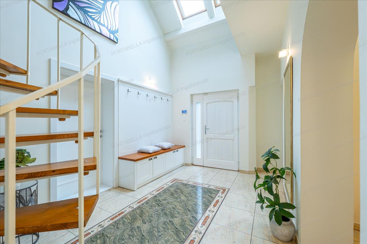 A ház egyik különleges éke az előtérben kialakított, kibontott födém, ahol 5, 4 méteres belmagasság és Velux tetőablakok teremtenek rendkívül világos, exkluzív térérzetet.