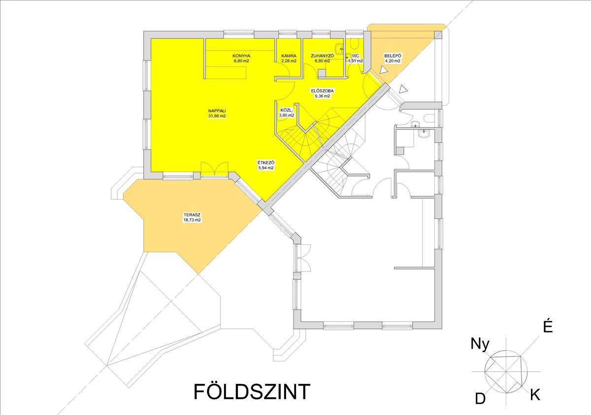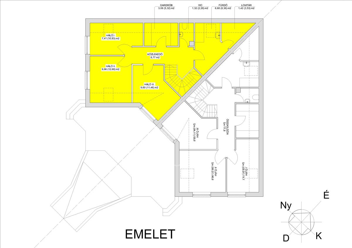 A háromszintes (alagsor + földszint + tetőtér), kétállásos gépkocsitárolóval rendelkező, kiváló tájolású és ezért valóban napfényes fél családiház kellemes terasszal csatlakozik a saját kertjéhez. a szintek között kényelmesen járható lépcső biztosít kapcsolatot. Az amerikai konyhás nappali valóban tágas, a konyha és étkezőrésszel együtt 44 m2 alapterületű és a konyharész mellett, abból nyílóan található a kamra is.