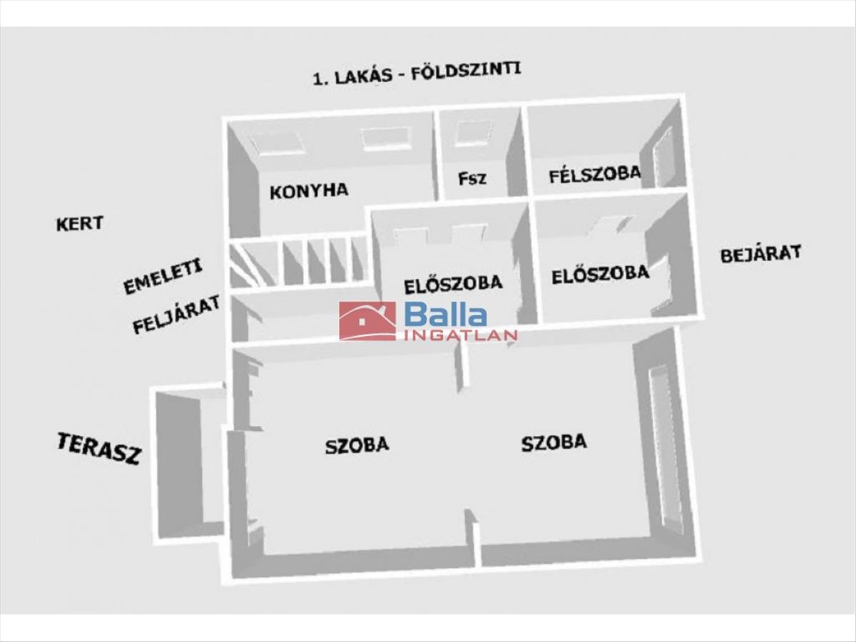 Az emeletes ház két lakásának helységei: