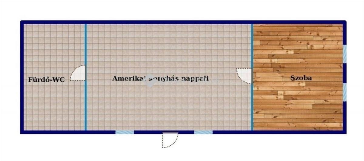 Beosztása tágas (40 m2) amerikai konyhás nappali, szoba (21 m2) és zuhanyzós fürdőszoba elkerített tároló résszel.