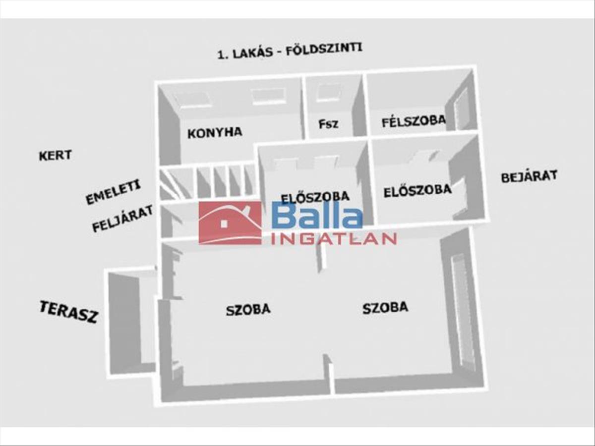 Az emeletes ház két lakásának helységei: