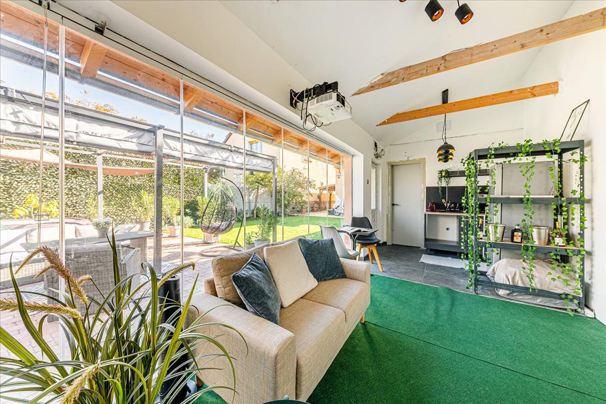 A 35 m²-es melléképület jelenleg zene stúdióként funkcionál, de igény szerint irodaként, műhelyként vagy hobbihelyiségként is hasznosítható. Itt található egy külön wc és egy nyári konyha is, amely eltolható üvegajtóval a terasszal egybenyitható, így ideális helyszín lehet baráti összejövetelekhez, családi eseményekhez.