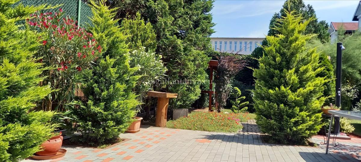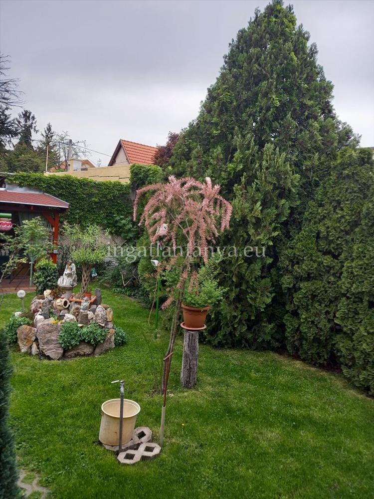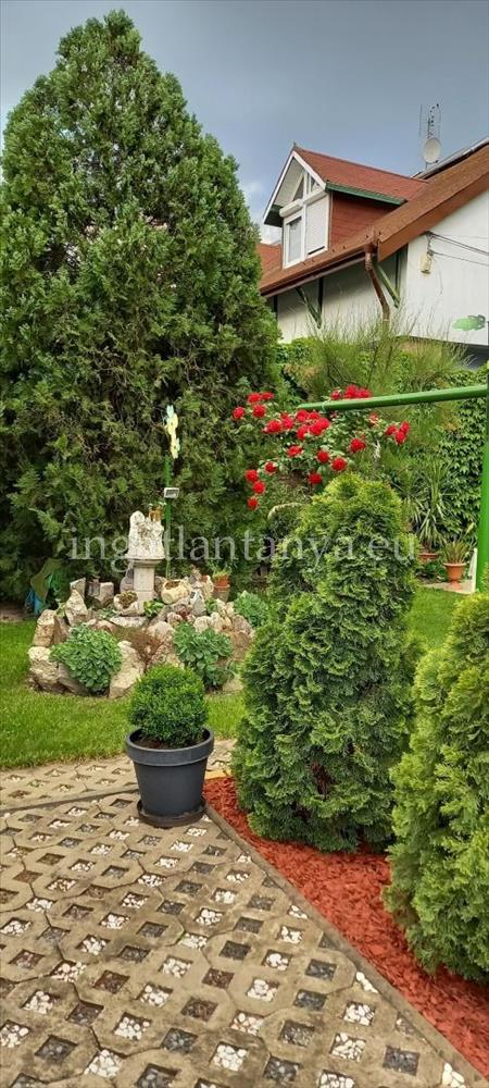 A kert szépen rendezett, több örökzölddel, garázzsal/tárolóval, szalettlivel, barátok fogadására, sütögetésre.