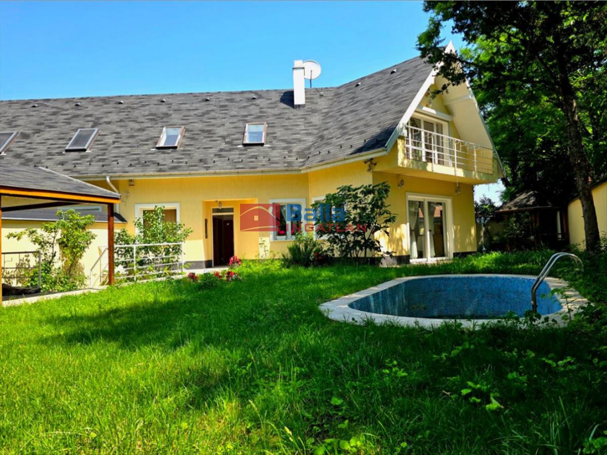 Az igényesen kialakított kertben, 10nm-es fedett tároló, medence, kerti sütögető, szaletli, esővízgyűjtő a locsoláshoz található.