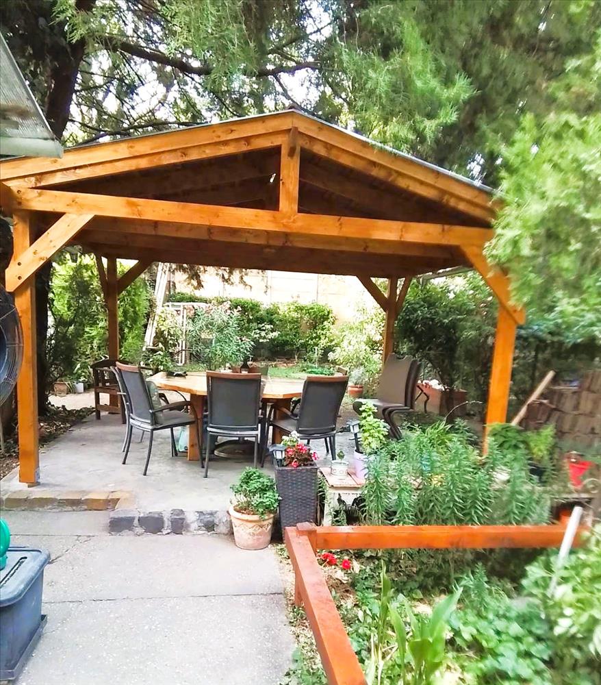 Gondozott kert, szaletlivel és sütögetővel, amely ideális pihenéshez, baráti és családi összejövetelekhez