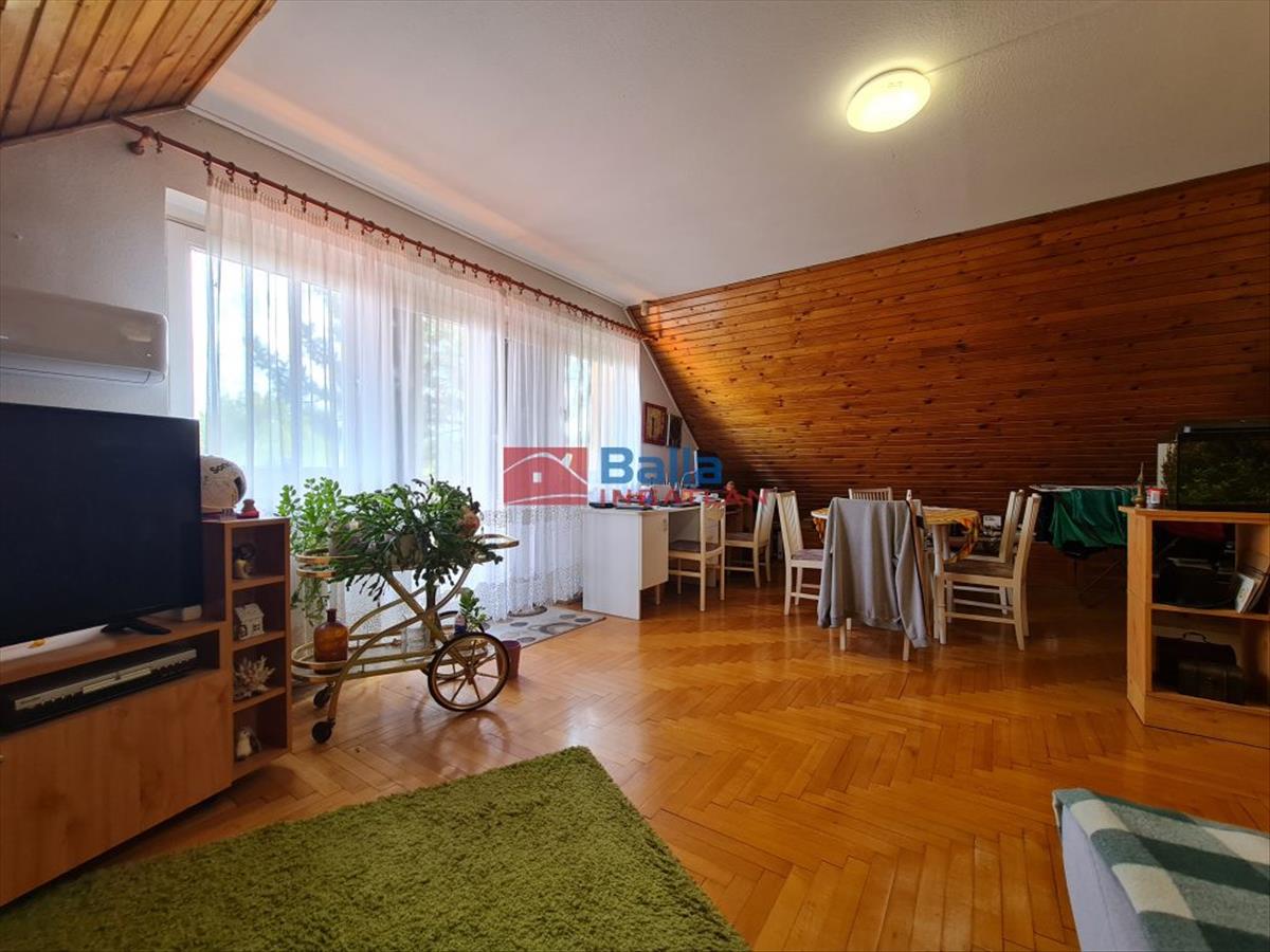 A lakásban konyha, kamra, étkező, fürdőszoba Wc-vel, egy hálószoba, gardróbszoba, hálófülke és egy privát fürdőszoba is helyet kapott, utóbbi még félkész állapotban van, de a lehetőség benne rejlik. Az emeleti lakás egy nappali + hálószobás, nettó 36, 5 n2-esm bruttó 58, 5 m2-es tetőtéri otthon, ahonnan széles erkély nyílik a medencére. a tetőablakos helyiségek világosak, barátságosak, a közös gázcirkó fűtés és meleg víz ellátás pedig kényelmes megoldást kínál.