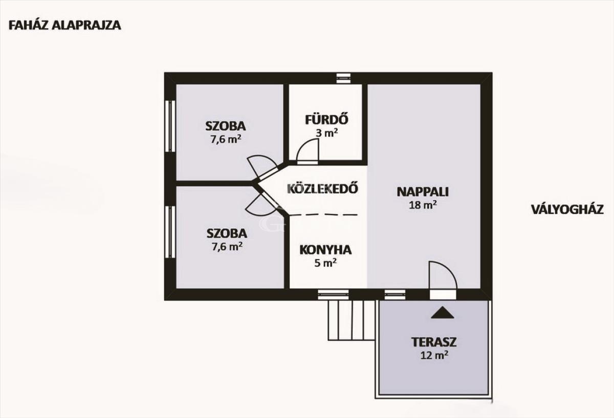 A teraszról tudunk belépni a 33 nm -es ingatlanba, melynek beton aljzat a megerősítése. Először az előtérbe jutunk. Jobbra a WC-vel is ellátott fürdőszobát találjuk, majd tovább haladva a konyhába léphetünk. a konyhából tudunk a délnyugati tájolású szobába bemenni, melynek ablaka a faház teraszára néz.