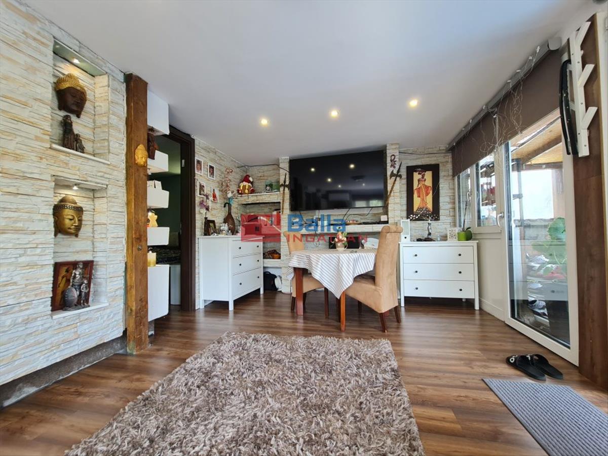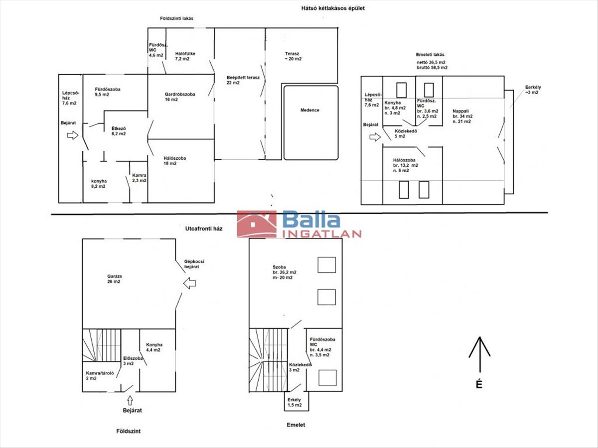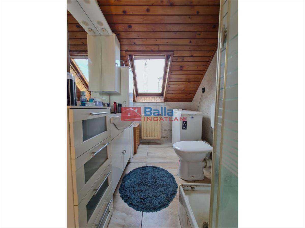 A lakásban konyha, kamra, étkező, fürdőszoba Wc-vel, egy hálószoba, gardróbszoba, hálófülke és egy privát fürdőszoba is helyet kapott, utóbbi még félkész állapotban van, de a lehetőség benne rejlik. Az emeleti lakás egy nappali + hálószobás, nettó 36, 5 n2-esm bruttó 58, 5 m2-es tetőtéri otthon, ahonnan széles erkély nyílik a medencére. a tetőablakos helyiségek világosak, barátságosak, a közös gázcirkó fűtés és meleg víz ellátás pedig kényelmes megoldást kínál.