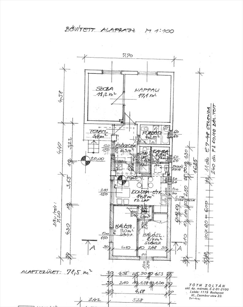 -előszoba(6, 4m2), fürdőszoba(4, 2m2), WC+kézmosó(4, 1m2), nappali(17, 1m2), hálószoba(11, 2m2), konyha+étkező(14, 8m2), kamra(2, 1m2), közlekedő(1, 4m2), 2 szoba(8, 4m2, 9m2).