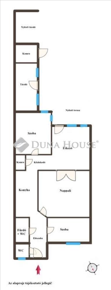 Rejt még magában lehetőséget a ház, mivel amerikai konyhás megoldással tágasabbá tehető a ház központi része, a nappali, ahonnan jelenleg az étkezőbe és a közlekedőbe tudunk menni. Másik két, kisebb szobája külön nyílik. a konyhához kamra is tartozik.