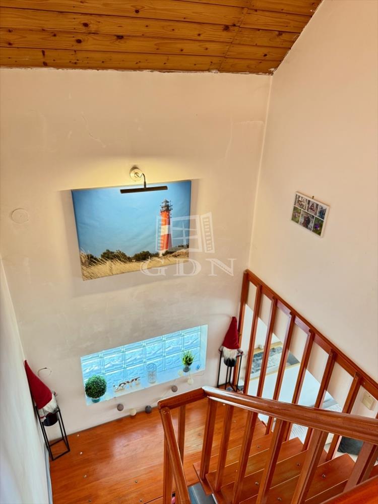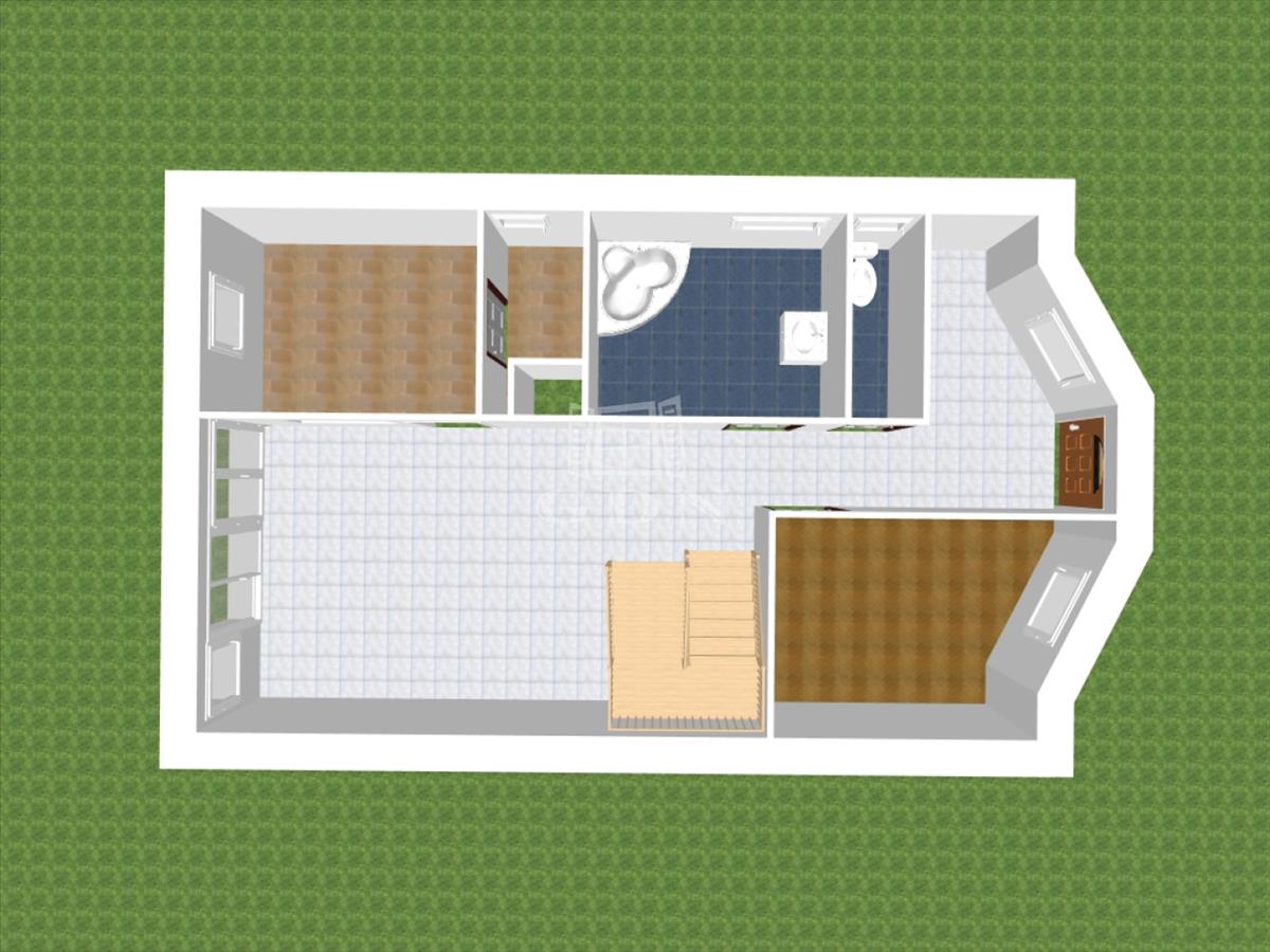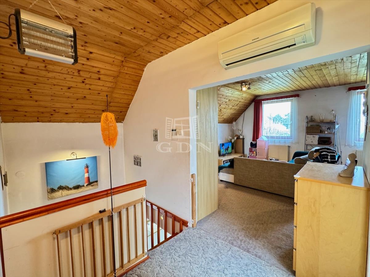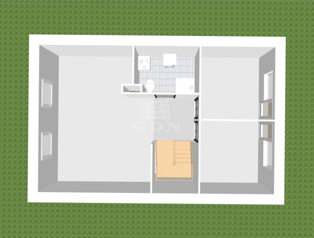 A földszinten, melynek hasznos alapterülete 74m2, előszoba (9m2), nappali (22, 5m2), vele egy légtérben konyha (7, 5m2), ezen kívül egy kamra (2m2), egy szoba (8m2), egy fürdőszoba (7m2), külön wc (2m2), illetve a bejáratnál 8m2, nappaliból pedig 13, 5m2 terasz található.