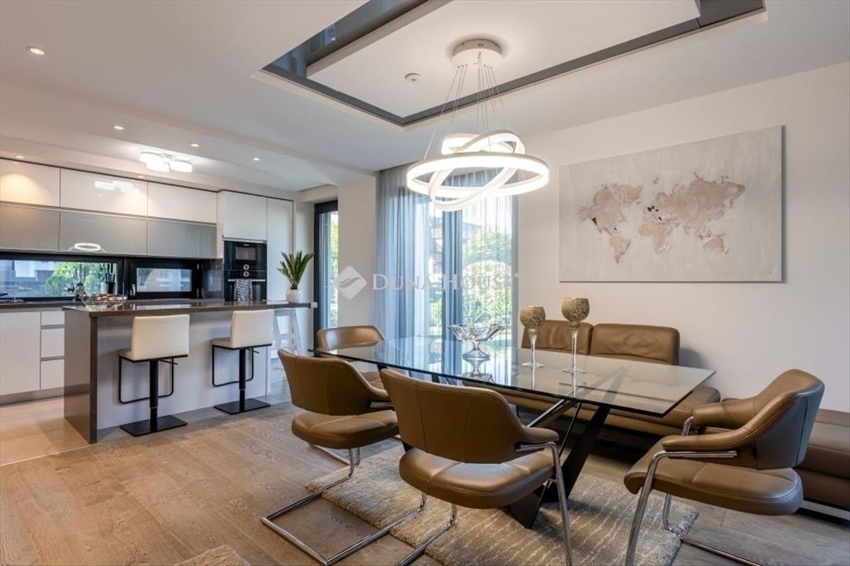 A prémium konyha letisztult színvilágával, modern beépített gépeivel és nagyméretű konyhaszigetével a ház központi tere. a berendezés része a cseh prémium konyhastúdió, a Sykora White Gloss kollekciója időtlen elegancia és ikonikus dizájn. Az étkezőben helyet kapott a joop! Német minőségű, bőr étkezőgarnitúra, amely modern megjelenésével tökéletesen illeszkedik az enteriőrhöz. a konyhaszigetet Panama bőr bárszékek egészítik ki acél vázzal és állítható magassággal.