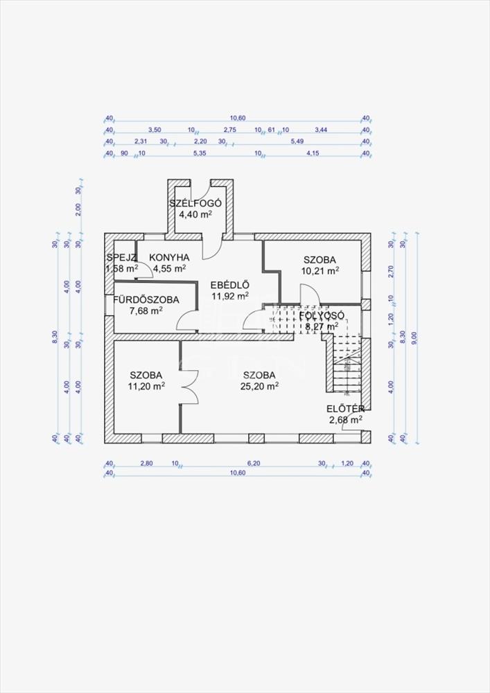 -előtér, nappali(25, 2m2), szoba(11, 2m2), szoba(10, 21m2), fürdőszoba(7, 68m2) konyha+étkező(16, 47m2), kamra(1, 58m2), szélfogó(4, 4m2)