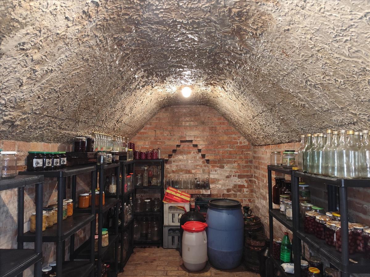 A házból a lépcsőkön lesétálva közelíthetjük meg a konténer garázst, melyből közvetlenül egy tágas mosókonyhához és szárító helyiséghez érkezünk, ahol a cirkófűtéshez tartozó kazán található. Onnan egy gardróbszobába juthatunk, ahonnan tovább lemehetünk a borospincébe.