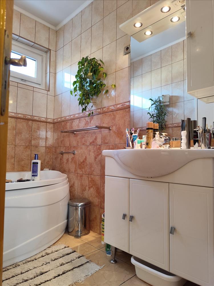 Szintén a nappaliból közelíthető meg a világos, tágas fürdőszoba, ahol pezsgőfürdős kád van.