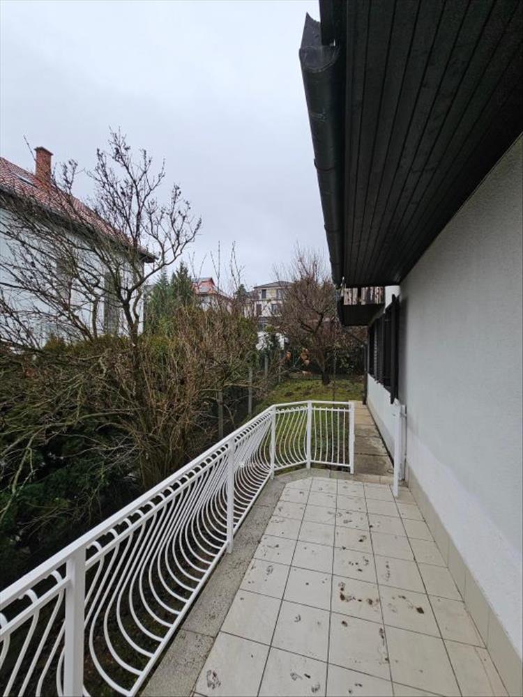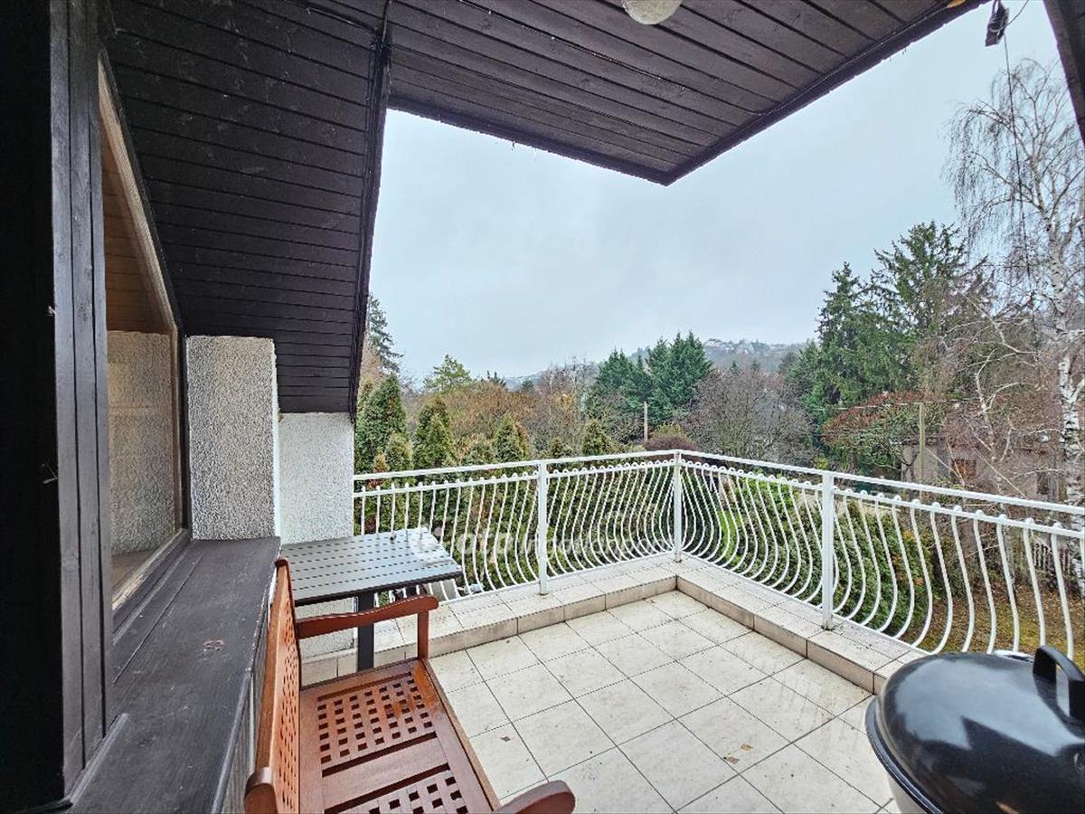 Az emeleti lakás elrendezése megegyezik a földszintiével: a nappali, étkező, konyha egybenyitott tér, amelyből nagy erkélyre léphetünk ki, ahonnan szép kilátás nyílik Rózsavölgyre.