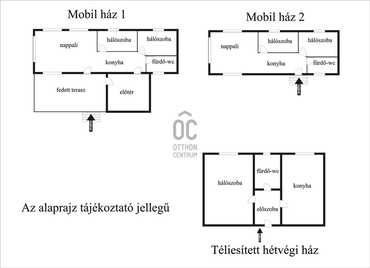 Első mobilház: hozzáépített terasszal előszobával együtt 54 nm, hőszigetelt ajtó ablakok. Nappali, 2 háló szoba, fürdőszoba teljesen berendezve (hűtő, mosógép, tv, tűzhely, bútorok. a fűtése 1 db Gree klíma, plusz helységenként villanyradiátor.