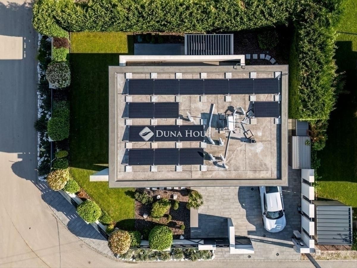A ház napelemes rendszerrel, saját akkumulátorokkal és elektromosautó-töltési lehetőséggel felszerelt modern, fenntartható megoldás a jövőre tervezve.