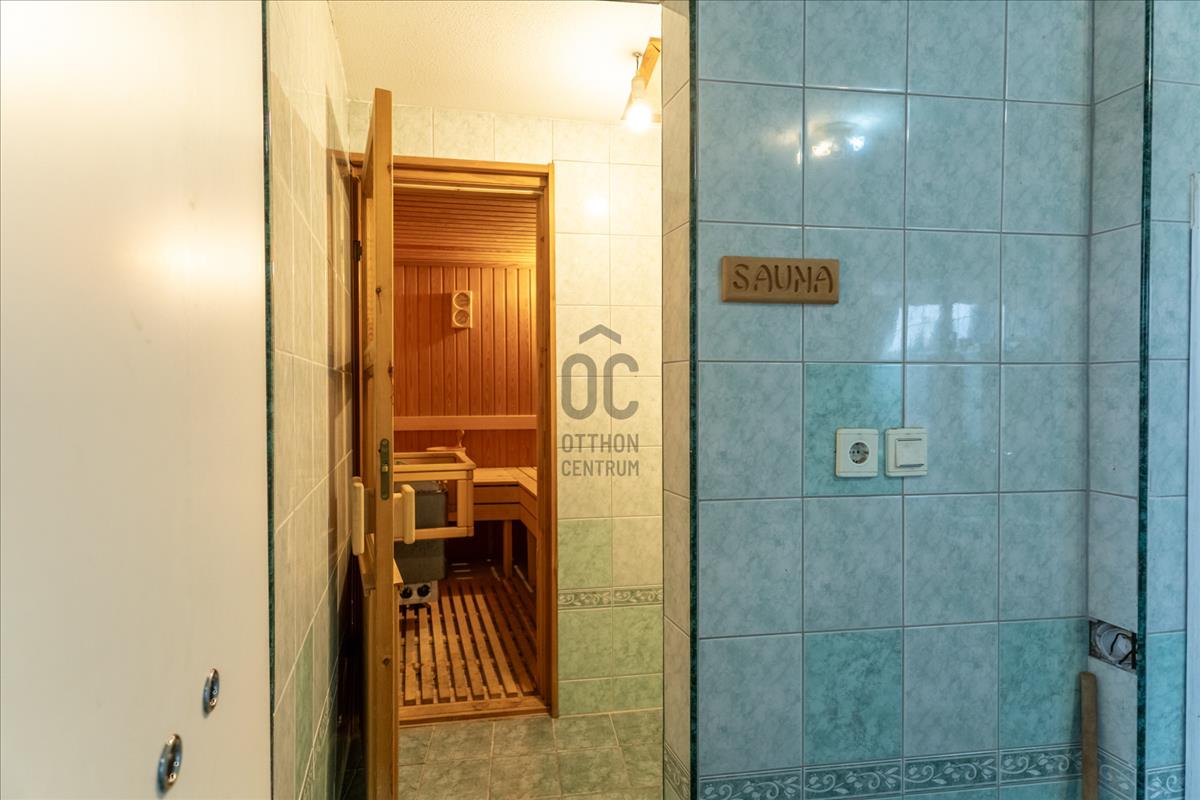 A házhoz tartozik az emeleten egy szauna is, amely lehetőséget ad a felnőtteknek a relaxálásra, míg a gyerekek a kertben játszanak.